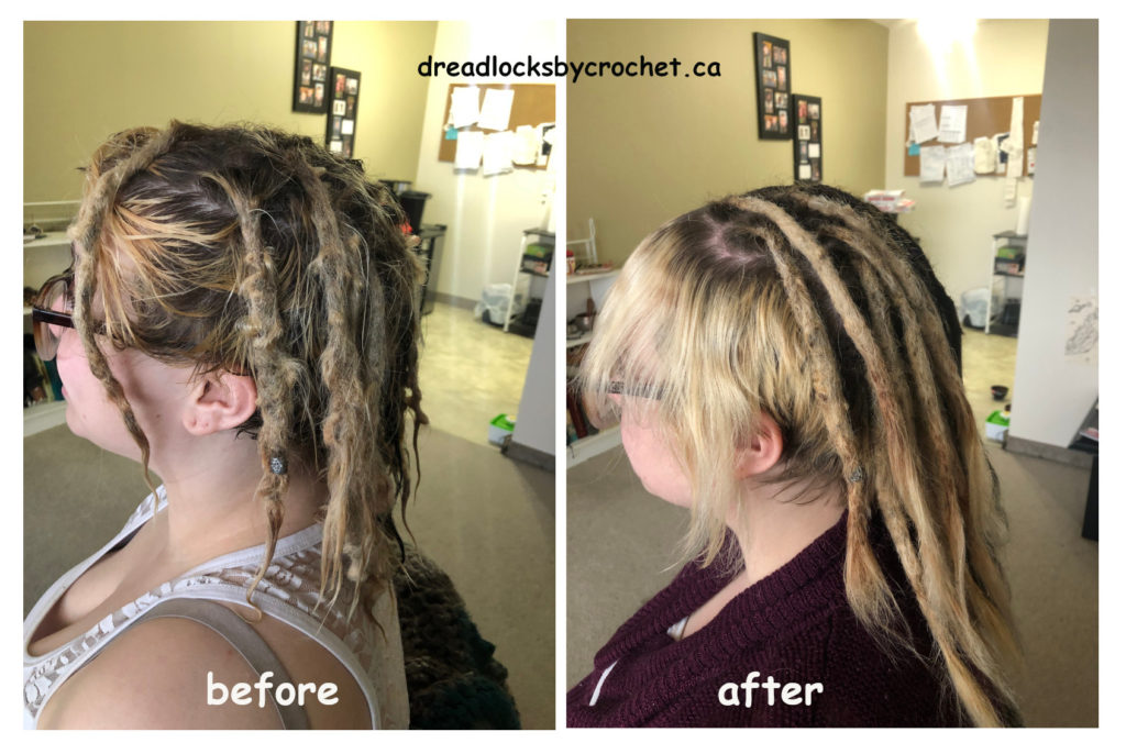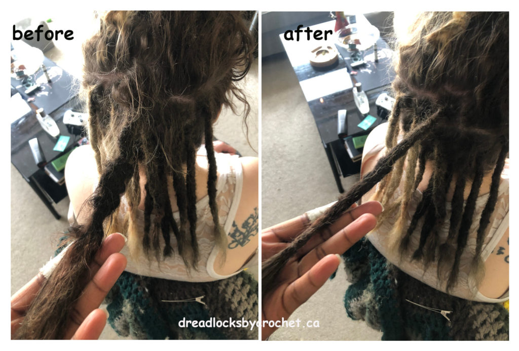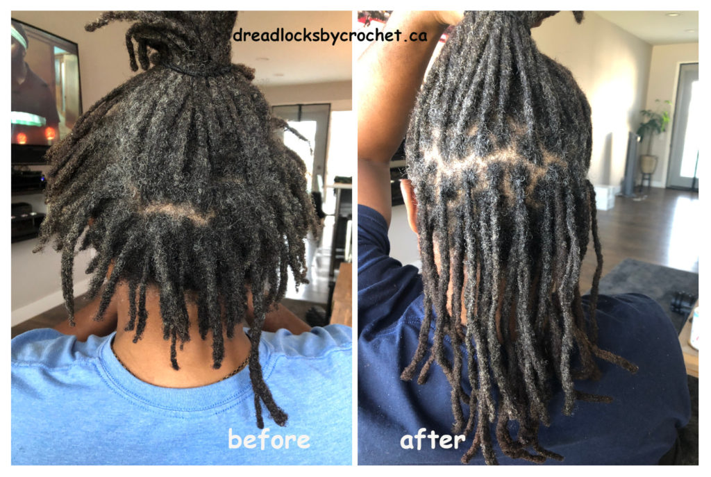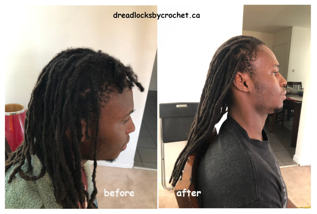 Dreadlocks Maintenance and Repair after a very long time. My client regretted cutting off his sides many years ago. He trimmed his dreadlocks time and again and kept the pieces. I was able to combine his trimmed dreadlocks to make new extensions and use the Crochet Method to attach them to the sides he had cut many years ago.